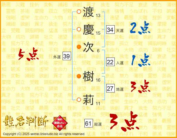 渡(13画)慶(15画)次(6画) 樹(16画)莉(11画)