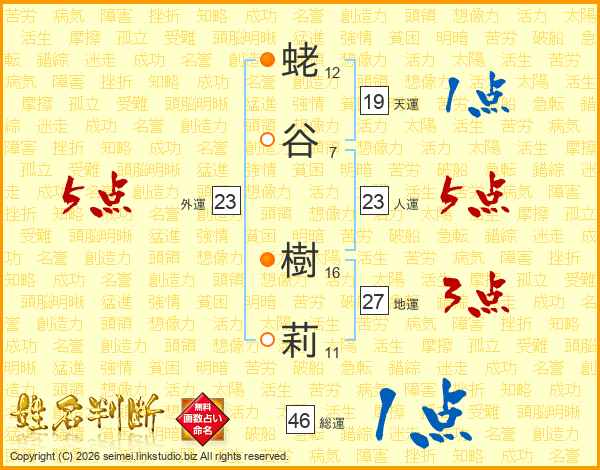 蛯(12画)谷(7画) 樹(16画)莉(11画)