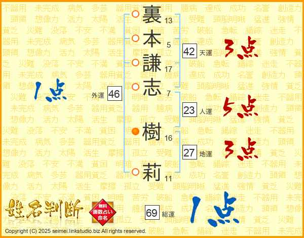 裏(13画)本(5画)謙(17画)志(7画) 樹(16画)莉(11画)