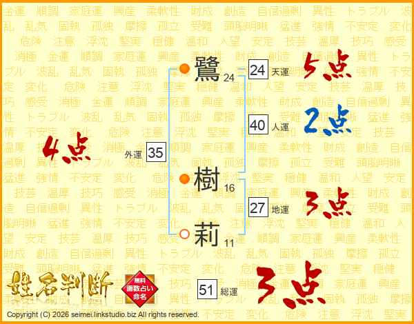 生活面を象徴する運勢です。外部から受ける影響力を表し、結婚運、家庭運や職場、環境への順応性を表します。総運から人運を引いた画数。姓や名が1文字の場合を除く。