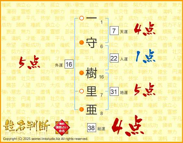 一(1画)守(6画) 樹(16画)里(7画)亜(8画)
