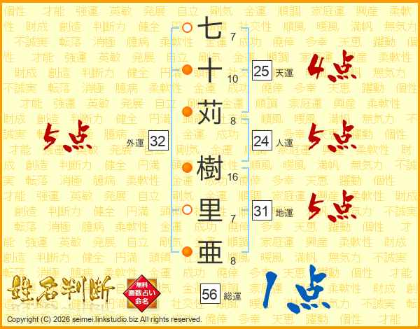七十苅樹里亜さんの外運は32画の5点!