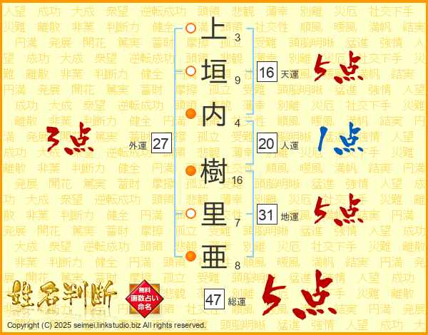 上(3画)垣(9画)内(4画) 樹(16画)里(7画)亜(8画)