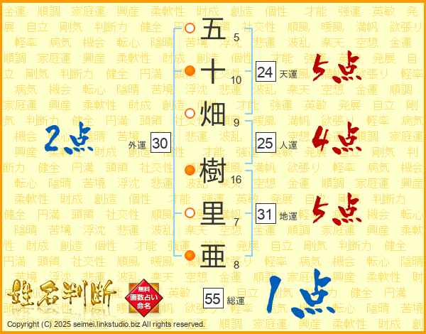 五(5画)十(10画)畑(9画) 樹(16画)里(7画)亜(8画)