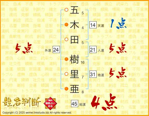 五木田樹里亜さんの総運は45画の4点!