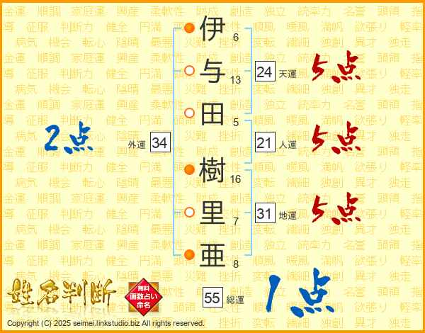 伊(6画)与(13画)田(5画) 樹(16画)里(7画)亜(8画)