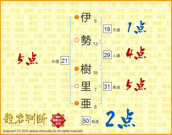 伊(6画)勢(13画) 樹(16画)里(7画)亜(8画)
