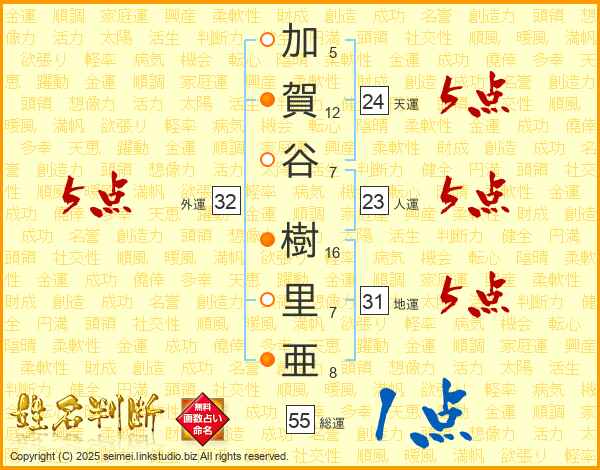 加(5画)賀(12画)谷(7画) 樹(16画)里(7画)亜(8画)