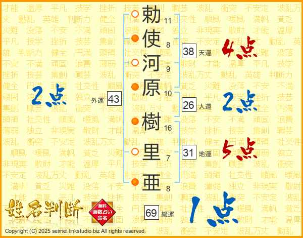勅(11画)使(8画)河(9画)原(10画) 樹(16画)里(7画)亜(8画)