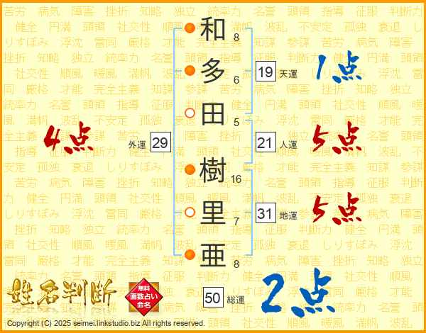 和(8画)多(6画)田(5画) 樹(16画)里(7画)亜(8画)