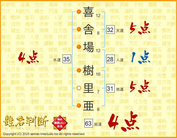 喜(12画)舎(8画)場(12画) 樹(16画)里(7画)亜(8画)