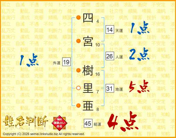 四(4画)宮(10画) 樹(16画)里(7画)亜(8画)