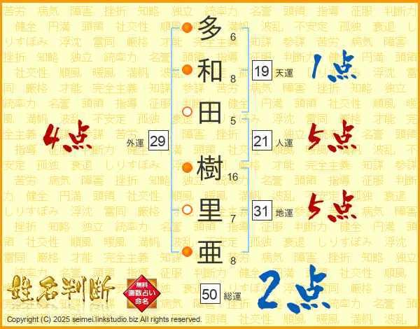 多(6画)和(8画)田(5画) 樹(16画)里(7画)亜(8画)