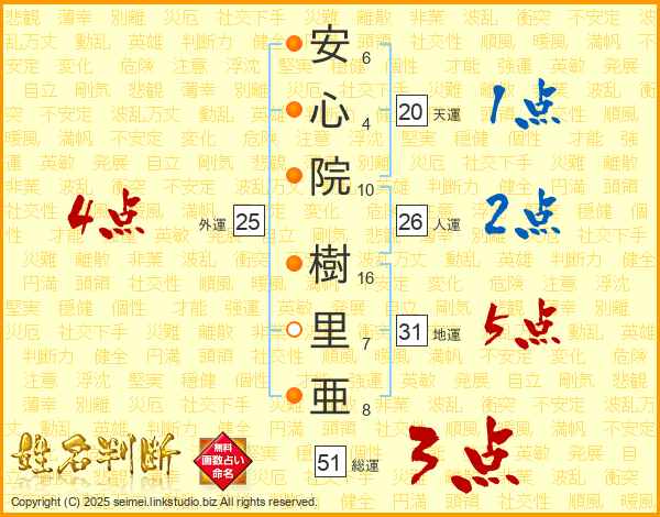 安(6画)心(4画)院(10画) 樹(16画)里(7画)亜(8画)