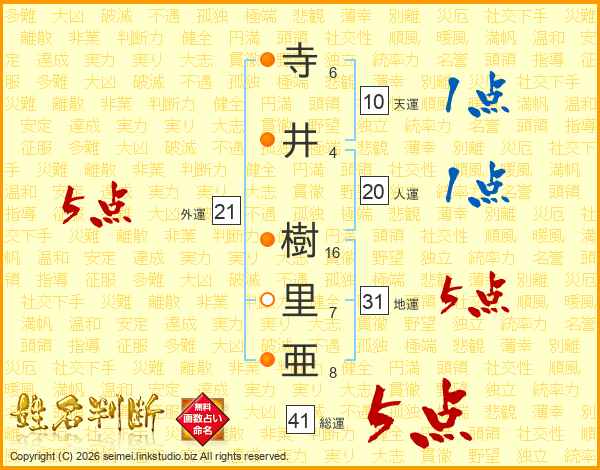 寺(6画)井(4画) 樹(16画)里(7画)亜(8画)