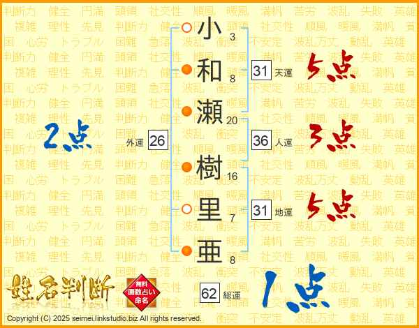 小(3画)和(8画)瀬(20画) 樹(16画)里(7画)亜(8画)
