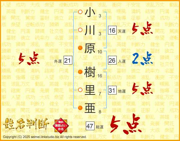 小(3画)川(3画)原(10画) 樹(16画)里(7画)亜(8画)