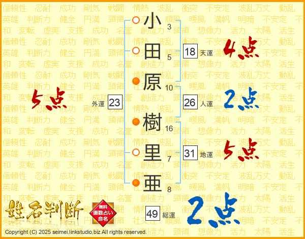 小(3画)田(5画)原(10画) 樹(16画)里(7画)亜(8画)