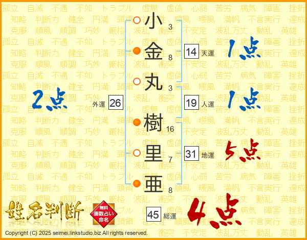小(3画)金(8画)丸(3画) 樹(16画)里(7画)亜(8画)