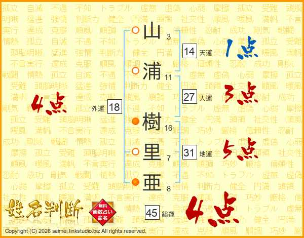 山(3画)浦(11画) 樹(16画)里(7画)亜(8画)
