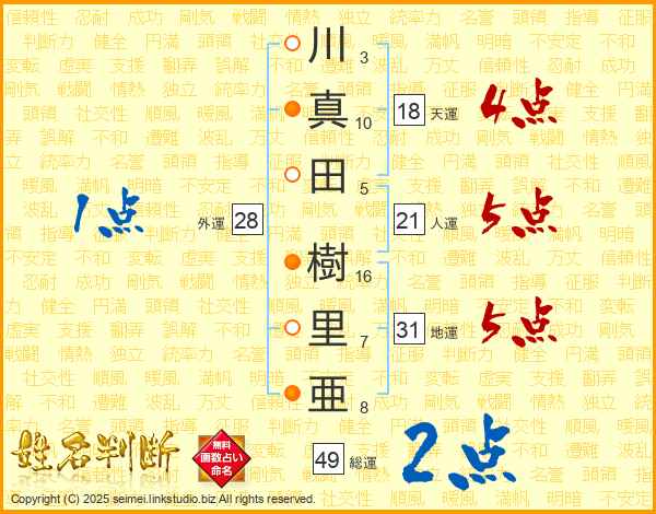川(3画)真(10画)田(5画) 樹(16画)里(7画)亜(8画)