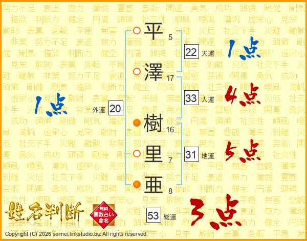 平(5画)澤(17画) 樹(16画)里(7画)亜(8画)