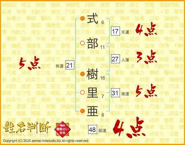 式部樹里亜さんの外運は21画の5点!