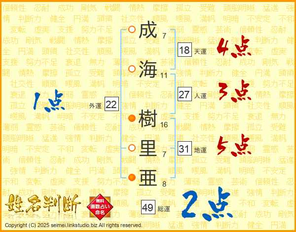 成(7画)海(11画) 樹(16画)里(7画)亜(8画)