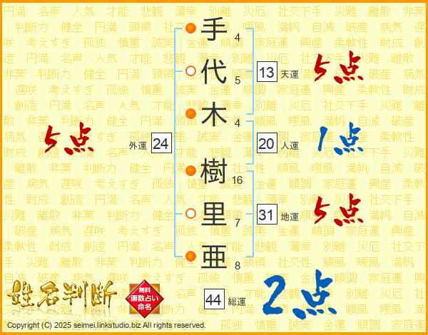 手(4画)代(5画)木(4画) 樹(16画)里(7画)亜(8画)