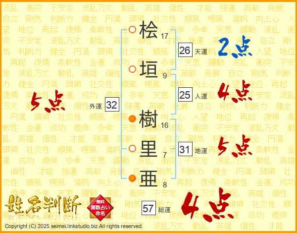 桧(17画)垣(9画) 樹(16画)里(7画)亜(8画)