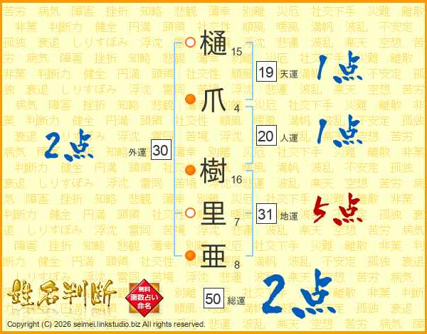 樋(15画)爪(4画) 樹(16画)里(7画)亜(8画)
