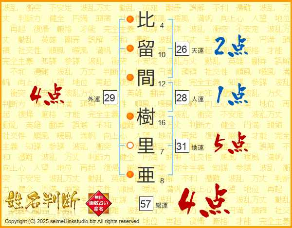 比(4画)留(10画)間(12画) 樹(16画)里(7画)亜(8画)