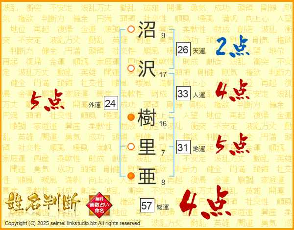 沼(9画)沢(17画) 樹(16画)里(7画)亜(8画)