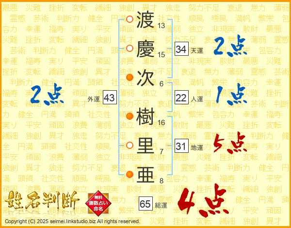 渡(13画)慶(15画)次(6画) 樹(16画)里(7画)亜(8画)