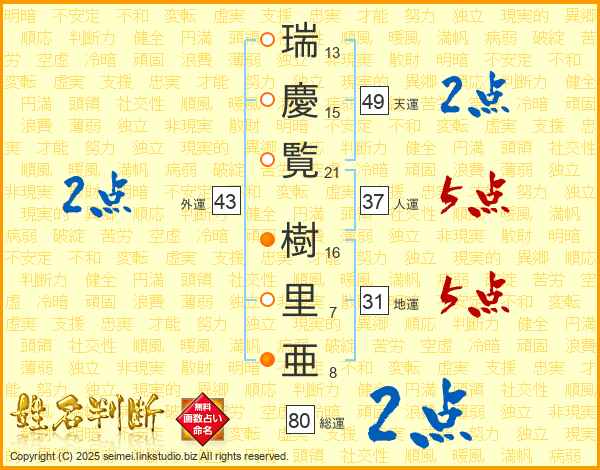 瑞(13画)慶(15画)覧(21画) 樹(16画)里(7画)亜(8画)