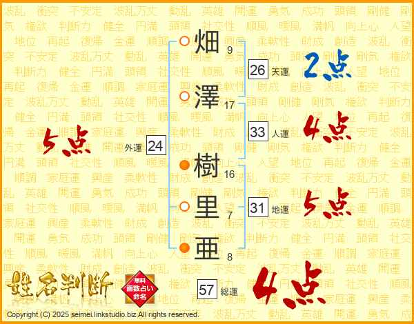 畑(9画)澤(17画) 樹(16画)里(7画)亜(8画)