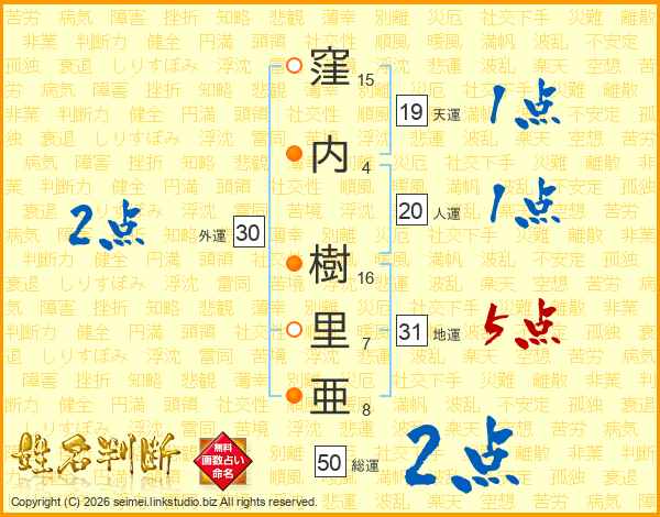 窪内樹里亜さんの地運は31画の5点!