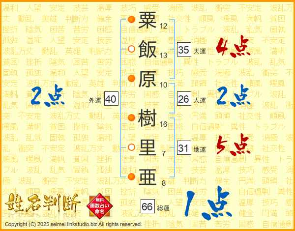 粟(12画)飯(13画)原(10画) 樹(16画)里(7画)亜(8画)