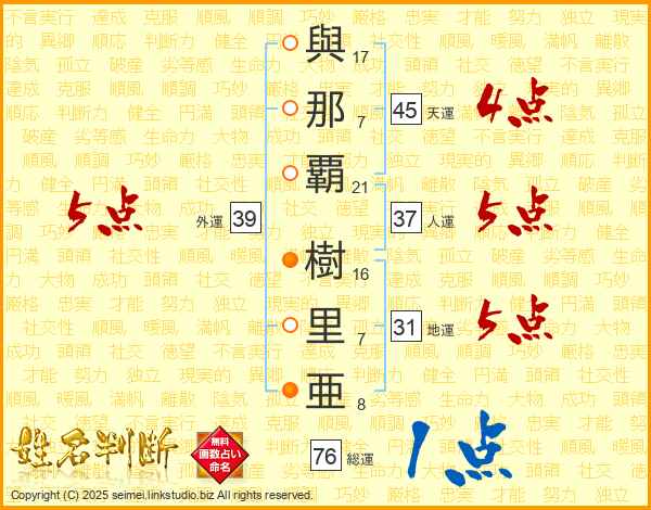 與(17画)那(7画)覇(21画) 樹(16画)里(7画)亜(8画)