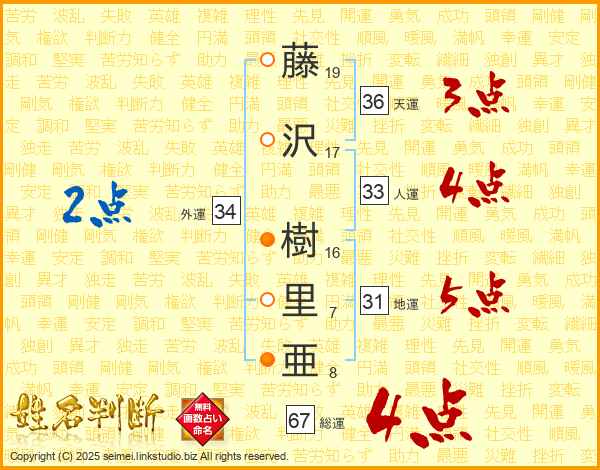 藤沢樹里亜さんの総運は67画の4点!