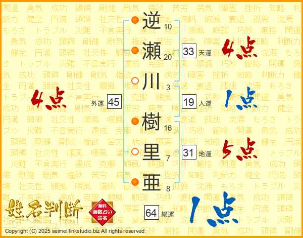 逆(10画)瀬(20画)川(3画) 樹(16画)里(7画)亜(8画)