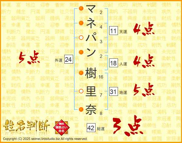 マ(2画)ネ(4画)パ(3画)ン(2画) 樹(16画)里(7画)奈(8画)