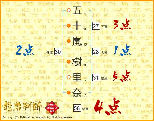 五(5画)十(10画)嵐(12画) 樹(16画)里(7画)奈(8画)