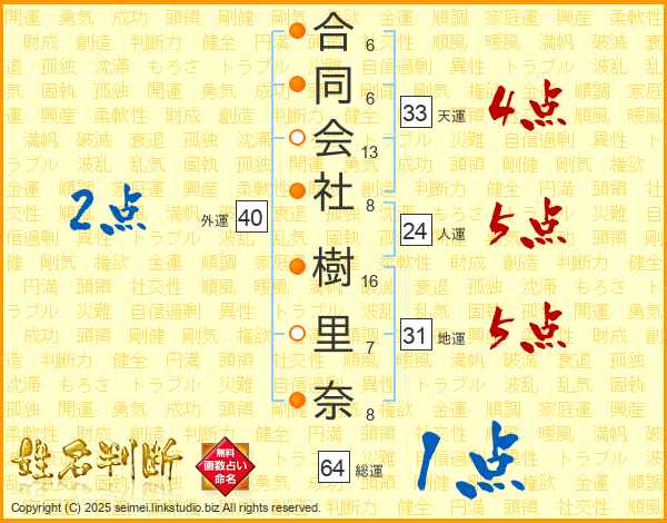 合(6画)同(6画)会(13画)社(8画) 樹(16画)里(7画)奈(8画)