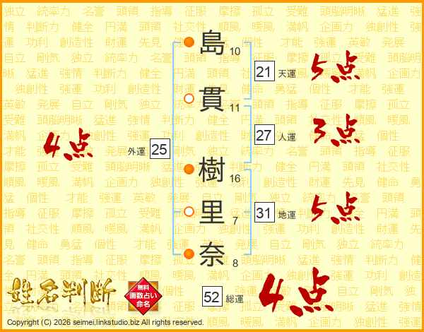 島(10画)貫(11画) 樹(16画)里(7画)奈(8画)