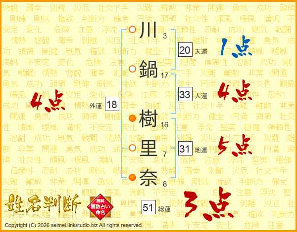 川鍋樹里奈さんの総運は51画の3点!