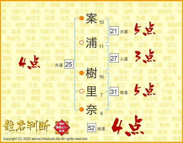案(10画)浦(11画) 樹(16画)里(7画)奈(8画)