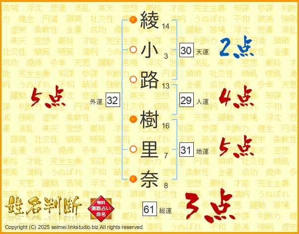 綾(14画)小(3画)路(13画) 樹(16画)里(7画)奈(8画)