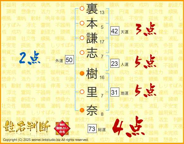 裏本謙志樹里奈さんの総運は73画の4点!