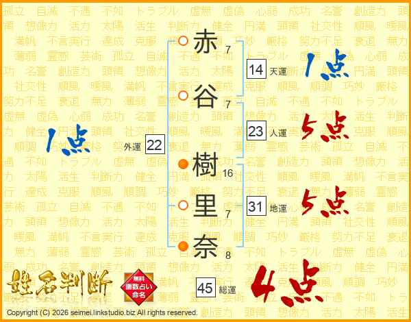 赤谷樹里奈さんの総運は45画の4点!